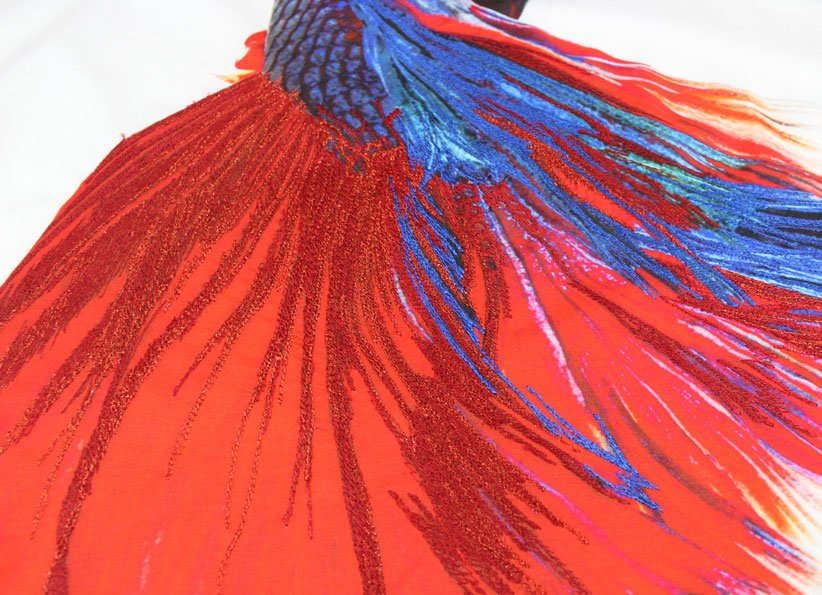 Stampa ink-jet su cotone, viscosa, seta con coloranti reattivi e pigmenti.